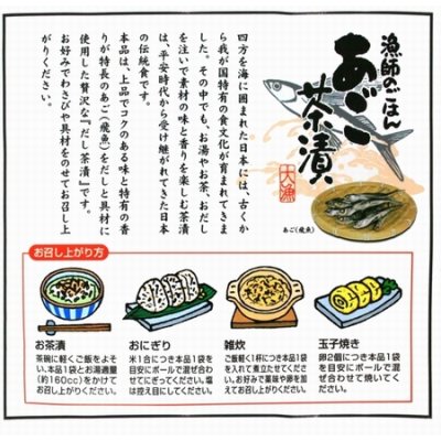 上品でコクのある味と特有の香りが特長のあご(飛魚)をだしと具材に使用した贅沢な『だし茶漬』です。
