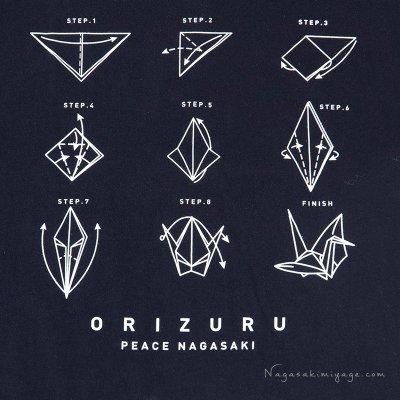 平和の象徴である折鶴をTシャツに表現しました。このTシャツを通じて、長崎から恒久平和を広く発信出来たらと思います。売上金の一部を平和推進協会に寄付しています。 折鶴の折り方手順がわかるように、展開図をTシャツに表現しました。折鶴という言葉が、世界平和を祈る言葉として、広く世界の人々に伝わることを期待しています。 ■素材:綿 100% ■サイズ:S、M、L、LL の4サイズ ■プリント:前面のみ